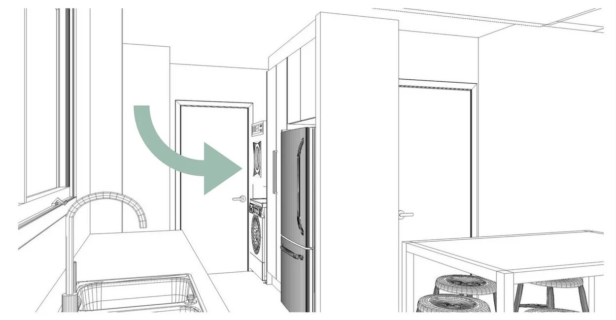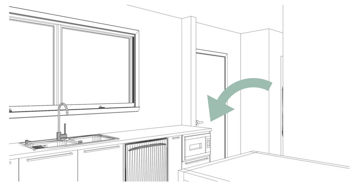 Since the space was small and we wanted it to look bright and fresh, I used artistic license to add more white in certain areas. Particularly for the darker coloured and timber grain schemes. We decided to use white on the tall pantry doors. It helped to make the room feel bigger.